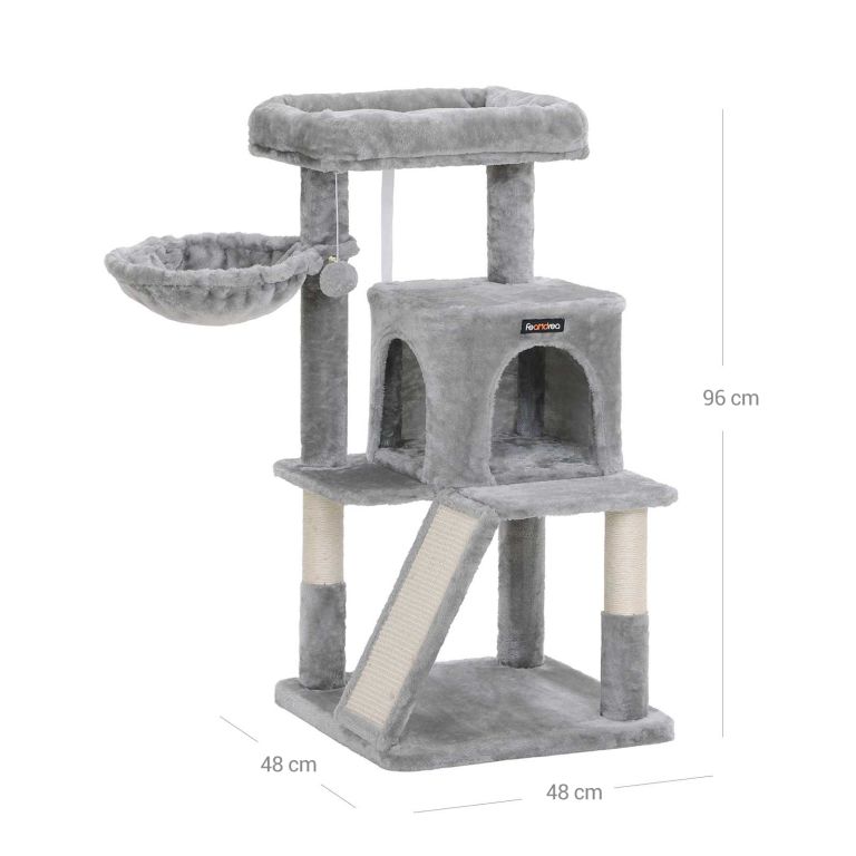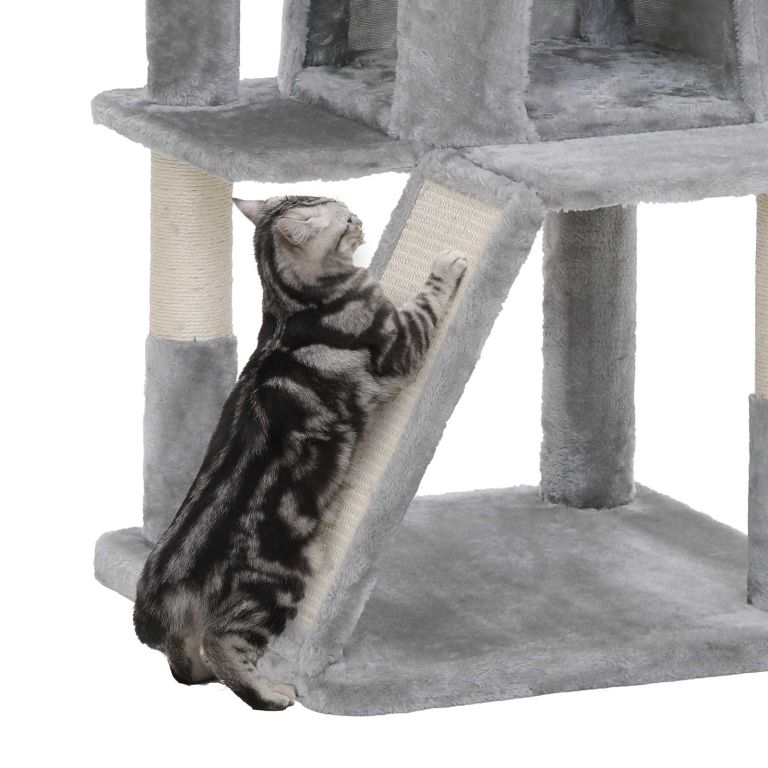 Construcția durabilă din PAL și baza solidă asigură siguranța. Stâlpii și rampa din sisal ajută la menținerea sănătății ghearelor. Montaj ușor, întreținere minimă.