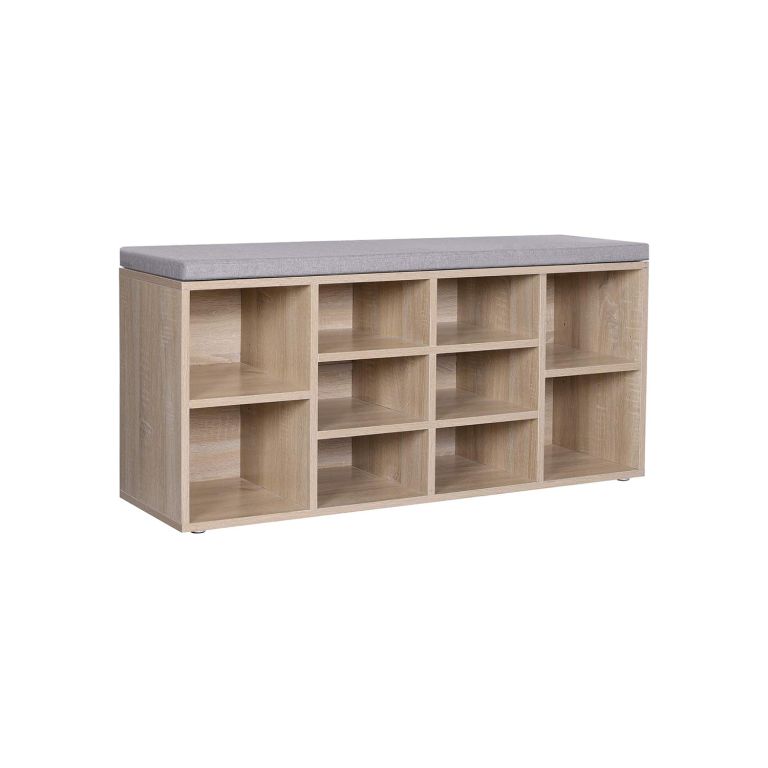 Bancă practică cu spațiu pentru pantofi, decor stejar, cu 10 compartimente și șezut moale.