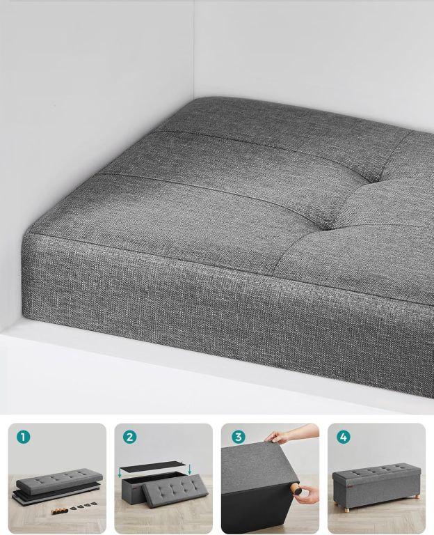 Structura din MDF și întăriturile metalice oferă rezistență și durabilitate. Materialul textil din in este ușor de curățat, iar montajul rapid și picioarele antiderapante asigură stabilitate și protecție pentru podea.