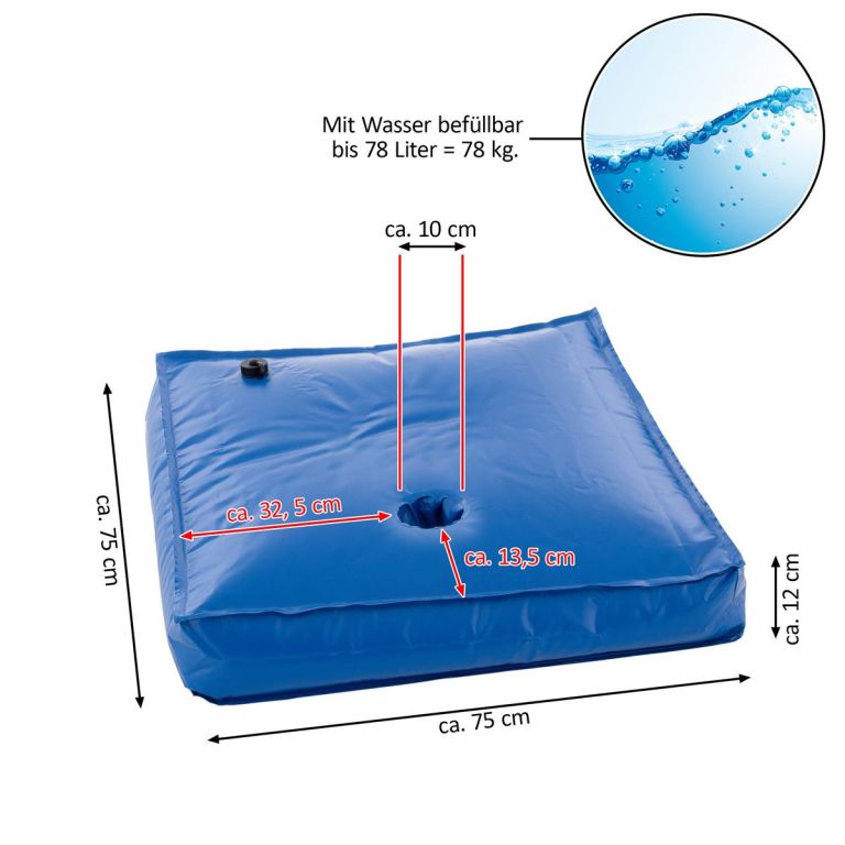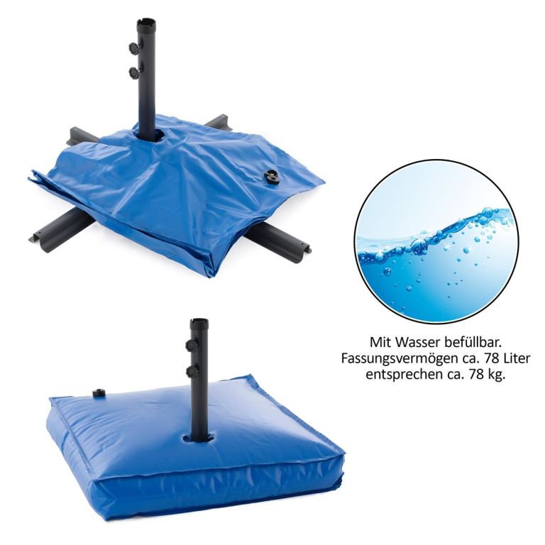 Pur și simplu așezați un suport de umbrelă de soare gol în locul dorit - cum ar fi o verandă, grădină, balcon sau terasă - și umpleți-l cu apă. În funcție de material și de cantitatea de umplere, se schimbă și greutatea acestuia (de ex. 78 de litri de apă = 78 de kilograme). Când nu aveți nevoie de suport, goliți-l și păstrați-l. Compusul ocupă doar un spațiu minim.