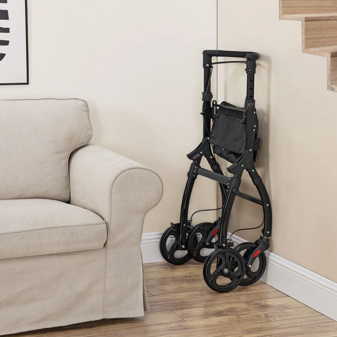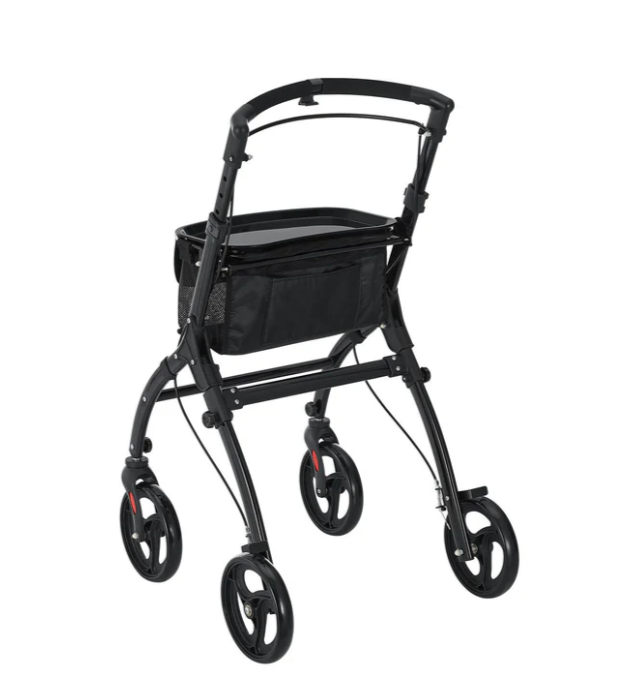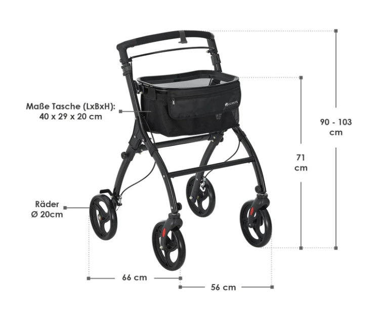Bucurați-vă de libertate și siguranță cu acest carucior de mers ușor și elegant. Mânerele moi și roțile pivotante fac fiecare mișcare plăcută, iar tava și geanta vă ajută să transportați tot ce aveți nevoie cu ușurință.