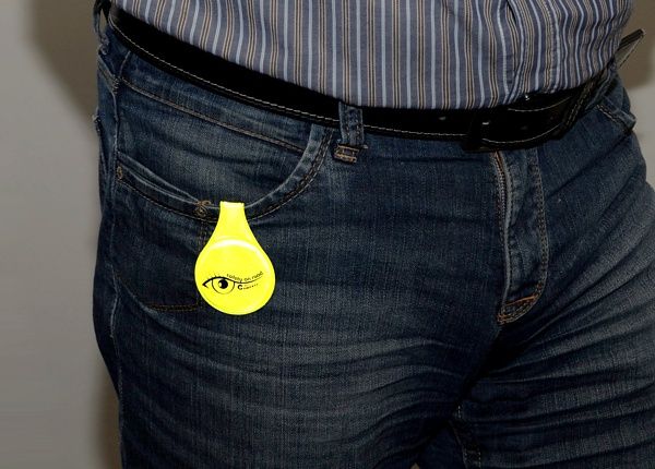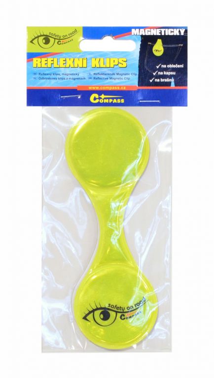 Clip reflectorizant magnetic galben, ușor de prins pe rucsac sau geantă pentru siguranță.