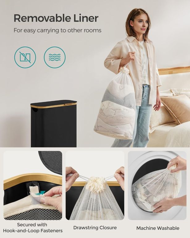 Descoperiți soluția elegantă pentru organizarea zilnică a rufelor – acest coș îngust cu margine din bambus transformă orice colț într-un spațiu primitor. Volumul de 65 litri oferă suficient loc pentru întreaga familie, iar capacul practic vă protejează intimitatea și păstrează rufele ferite de praf și priviri indiscrete.