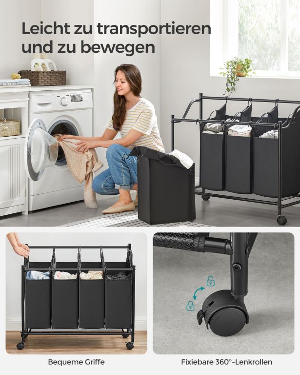 Construcția robustă din țevi de oțel și sacii rezistenți cu strat PVC asigură o utilizare îndelungată. Capacitatea generoasă de 4×35 litri și roțile cu frână facilitează mutarea și stabilitatea. Sacii detașabili permit transportul rapid direct la mașina de spălat, iar întreținerea este simplă.