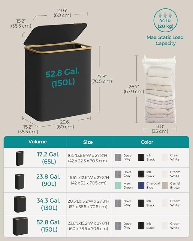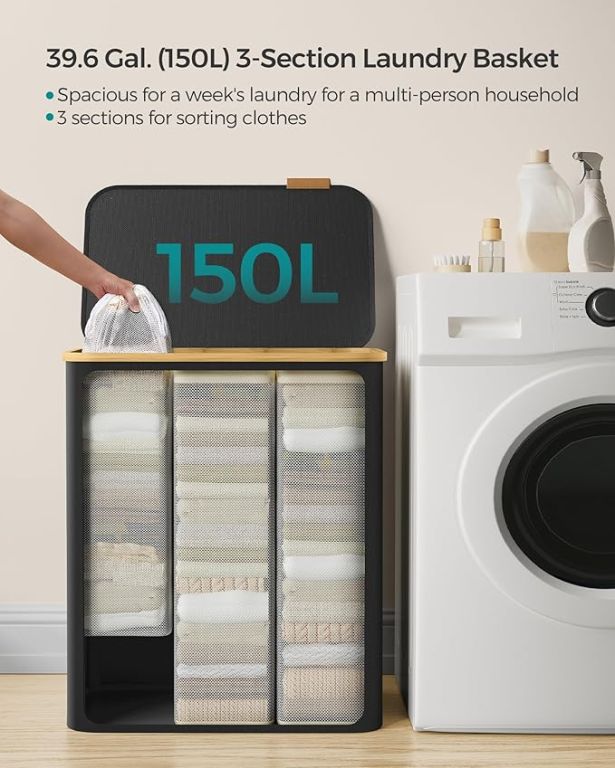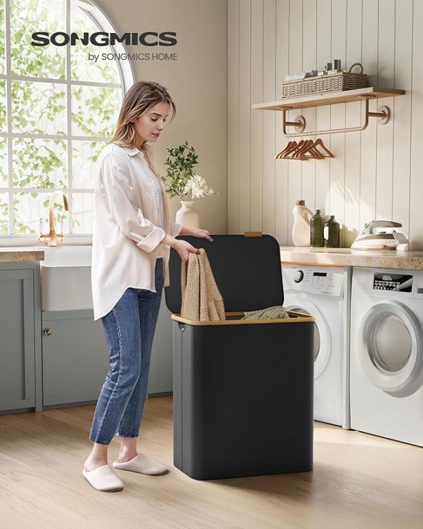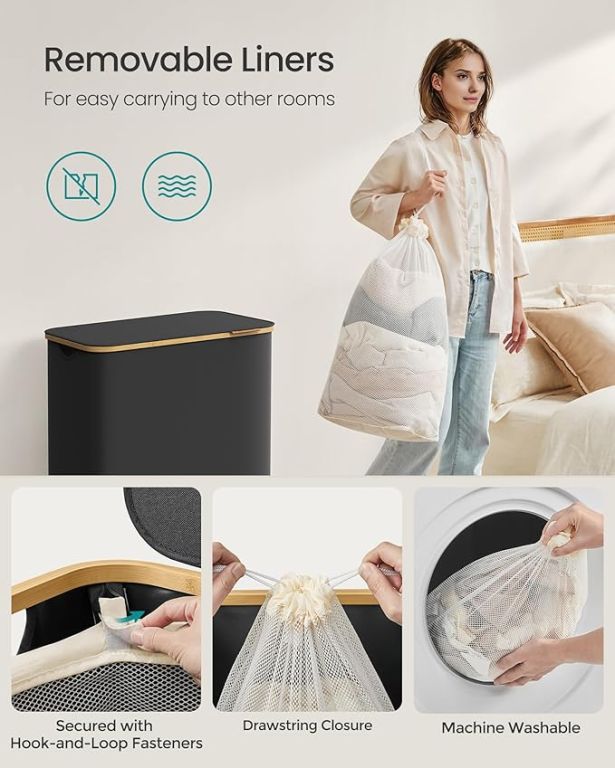 Organizați-vă rufele cu stil și eficiență datorită acestui coș spațios de 150 litri. Compartimentele multiple vă ajută să sortați rapid hainele, iar designul modern cu ramă din bambus adaugă un plus de eleganță locuinței. Capacul practic menține totul ordonat și discret.