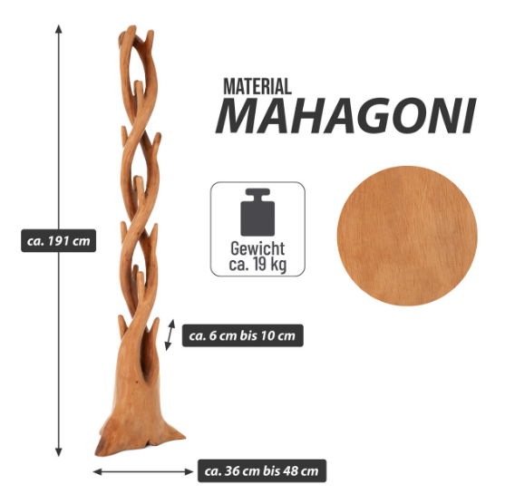 Realizat din lemn masiv de mahon lăcuit, cuierul oferă stabilitate și rezistență pe termen lung. Montajul nu este necesar, iar întreținerea se face rapid cu o cârpă umedă. Materialele sunt sustenabile, iar produsul este aproape indestructibil.