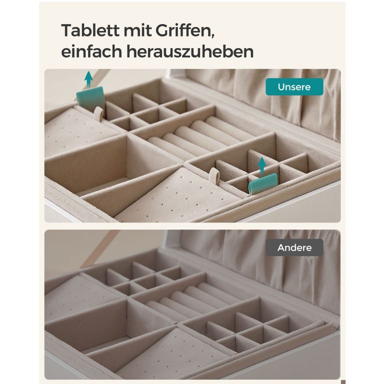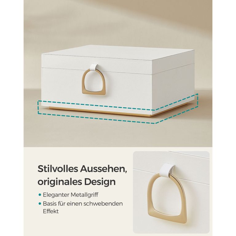 Descoperiți farmecul organizării perfecte cu această cutie de bijuterii SONGMICS în nuanțe de alb și auriu. Designul său modern și detaliile rafinate aduc o notă de lux oricărui interior, transformând păstrarea bijuteriilor într-o adevărată plăcere. Fiecare piesă își găsește locul, iar accesoriile dumneavoastră vor fi mereu la îndemână și în siguranță.