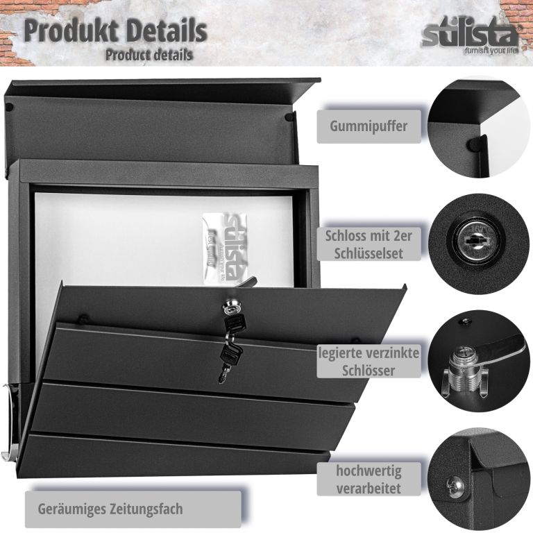 Cutia poștală de perete Stilista, cu un design modern, oferă o mulțime de spațiu de depozitare pentru scrisorile și cărțile poștale. Cutia poștală are o deschizătură mare pentru scrisori și, prin urmare, este potrivită și pentru scrisorile mari și plicurile mai groase. Acestea sunt astfel protejate de intemperii. Datorită materialului de asamblare furnizat, puteți asambla rapid și ușor cutia postala.