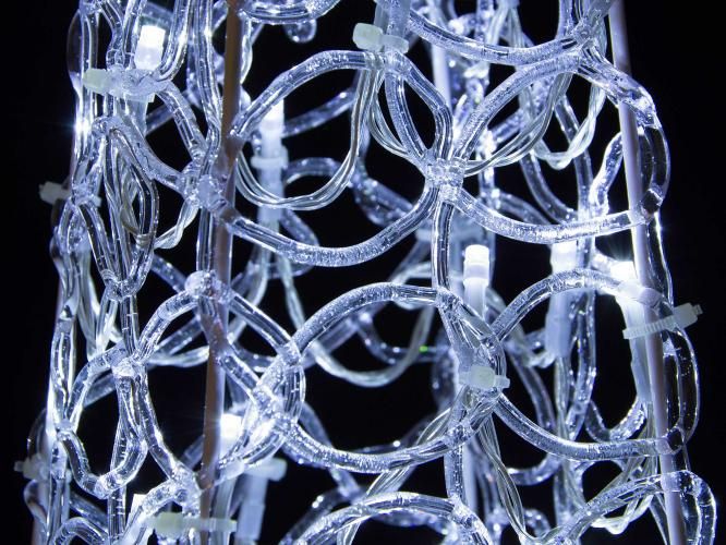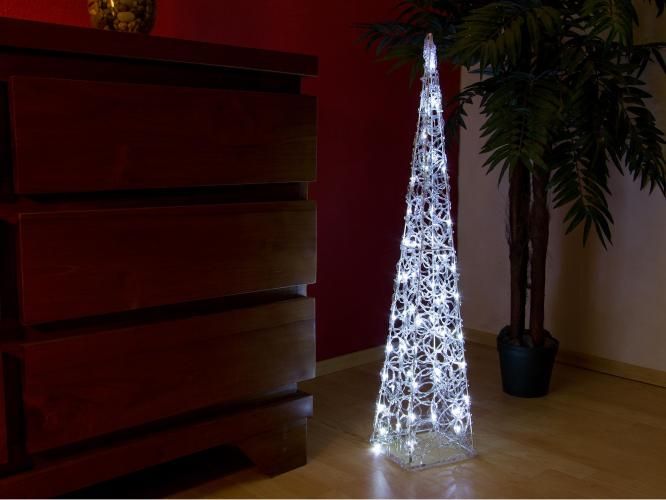 Puteți folosi decorul luminos original în formă de piramidă nu numai în timpul sărbătorilor de Crăciun, ci literalmente pe tot parcursul iernii. Acul are o înălțime de 90 cm și veți găsi 60 de bucăți de diode LED-uri albe reci, care se caracterizează printr-o durată lungă de viață și un consum redus de energie. Lumina lor se va încălzi și vă va plăcea sufletul.