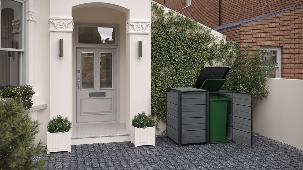Transformați aspectul curții cu un dulap modern și practic pentru pubele, ce aduce ordine și stil spațiului exterior. Ideal pentru familii și gospodării care doresc să ascundă discret pubelele și să mențină curățenia în jurul casei.