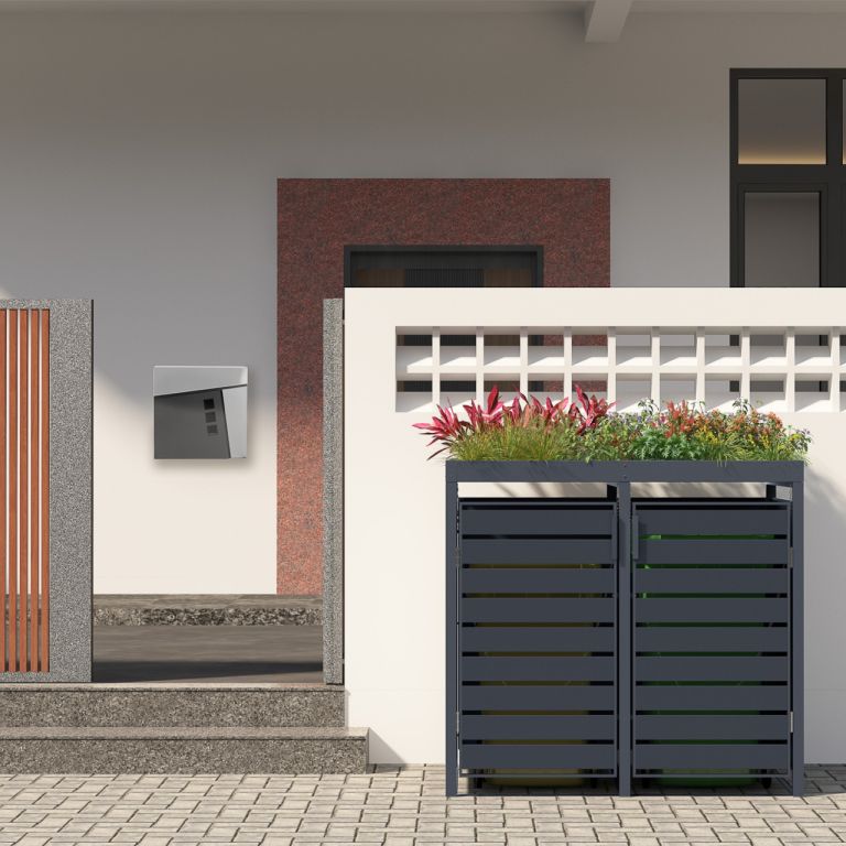 Dulap exterior pentru pubele, cu acoperiș pentru plante și ventilație eficientă.