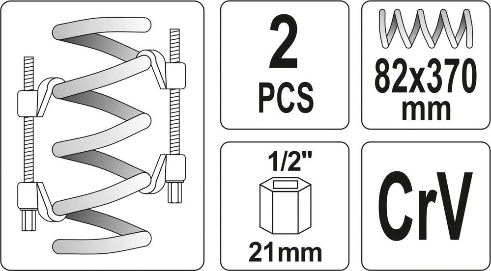 Lungimea dispozitivului de extracție de 370 mm, lățimea de 82 mm și capătul de 1/2" / 21 mm asigură îndepărtarea ușoară a arcurilor elicoidale obișnuite din automobile. Kitul este compus din două extractoare care comprimă arcul amortizorului și permit demontarea/montarea acestuia.
