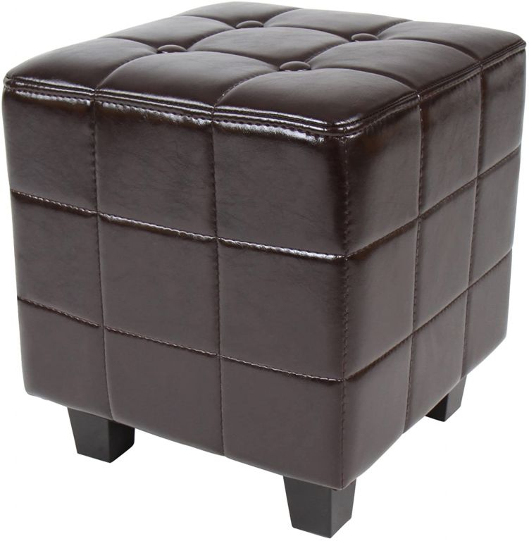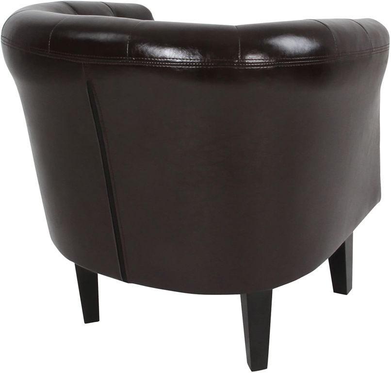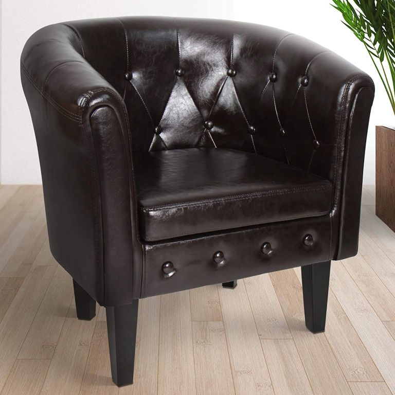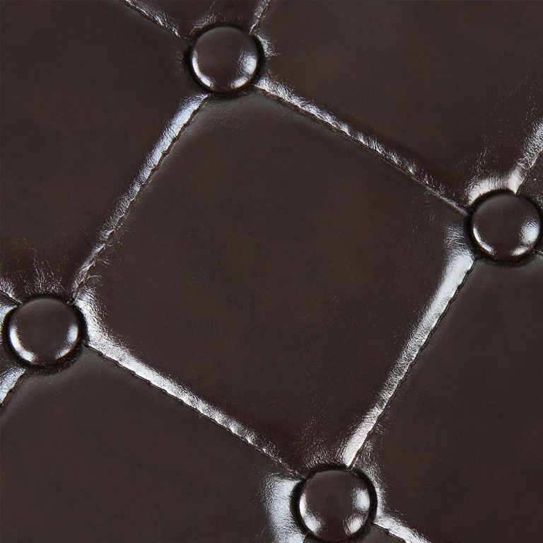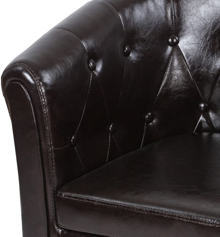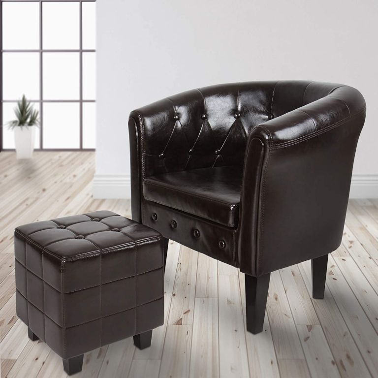 Un fotoliu Chesterfield maro, cu un taburet, va decora apartamentul dvs.Este fabricat din lemn masiv și acoperit cu un strat de plastic.