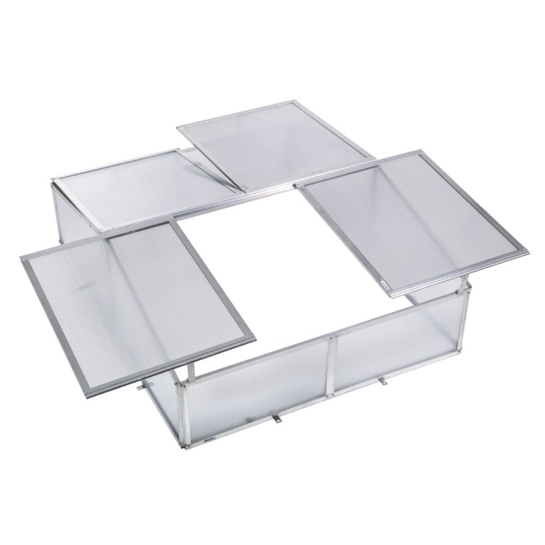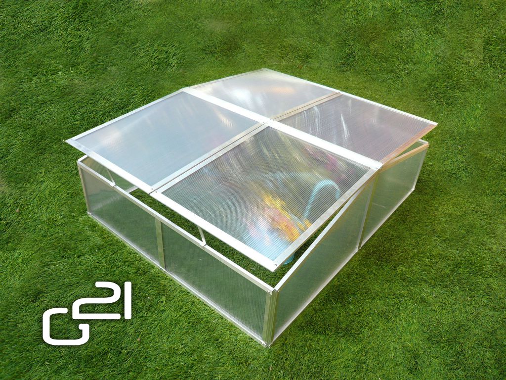 Sera din două piese este fabricată din plăci de policarbonat cu pereți dubli de înaltă calitate, cu o grosime de 4 mm, cu filtru UV, care asigură o bună circulație a luminii în interiorul serei. Construcția sa este realizată din profile de aluminiu de calitate superioară anodizat. Ferestrele cu balamale vă oferă un acces excelent în seră. O parte a fiecărei plăci de policarbonat este acoperită cu o folie albă. Această parte este protejată împotriva razelor UV, astfel încât este concepută ca un perete exterior orientat spre soare.