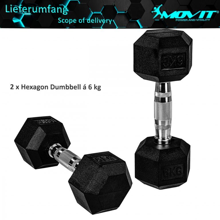 Gantera de cauciuc hexagonală MOVIT 6 kg, set de 2 bucăți