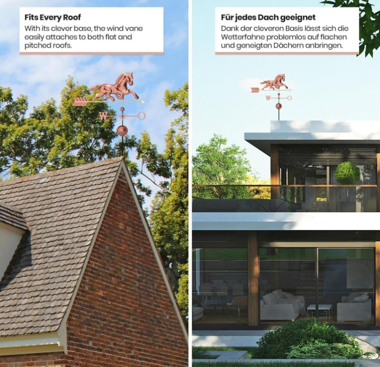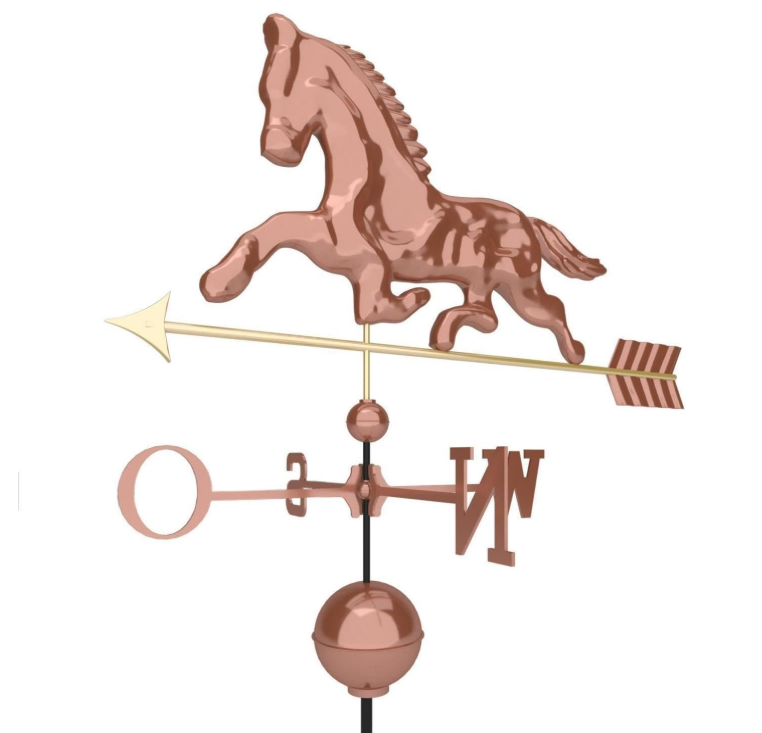 Giruetă cal din cupru, montaj universal, design tradițional și protecție împotriva păsărilor.