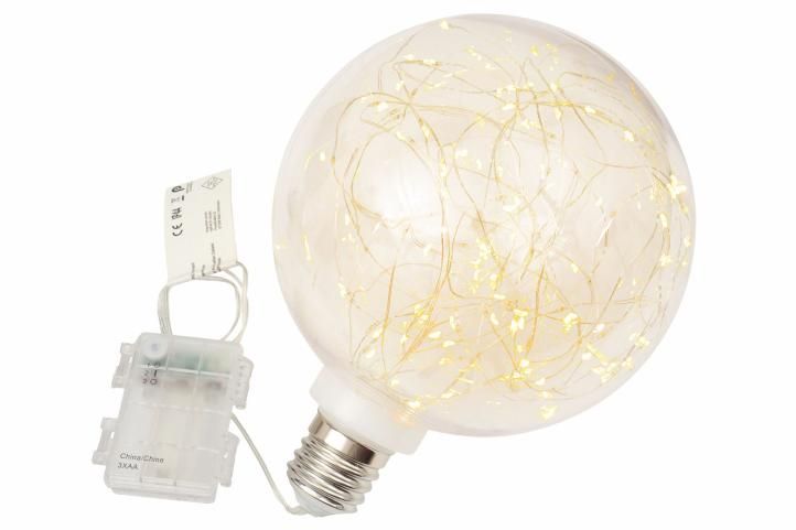 Globul neobișnuit de Crăciun imită aspectul unui bec, inclusiv firul acestuia. "Becul" este umplut cu un lanț fin de LED-uri cu 80 de diode. LED-urile sunt un înlocuitor popular pentru becurile tradiționale cu incandescență. În comparație cu becurile convenționale, LED-urile nu emit căldură, sunt rezistente la șocuri și pot economisi până la 90% din energia pe care ați folosi-o pentru becurile convenționale. Durata medie de viață a unui LED este de 2.000 de ore de iluminare (un bec normal aproximativ 1.000 de ore, în funcție de luminozitate).