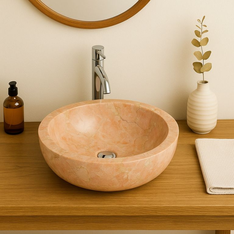 Lavoarul de blat de designer Gemma este fabricat dintr-o singură bucată de piatră fără lipire. Acest lavoar luxos din piatră este rotund și lustruit manual, datorită căruia este neted și strălucește frumos. Grosimea peretelui nu este niciodată mai mică de 3 cm, datorită căreia chiuveta este foarte puternică și aproape incasabilă. Găurile de scurgere au dimensiunea europeană standard.