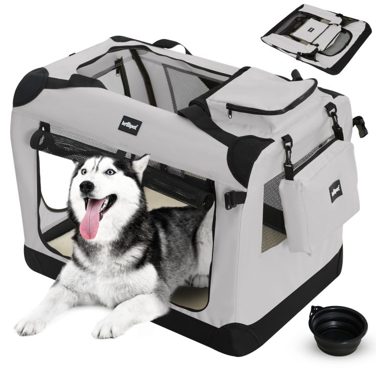 Cușcă pliabilă pentru câini cu mânere ergonomice, pernă și castron lavabile. Călătoriți fără stres și cu confort maxim.