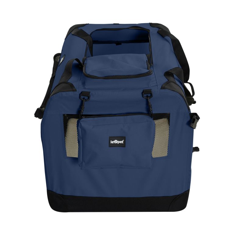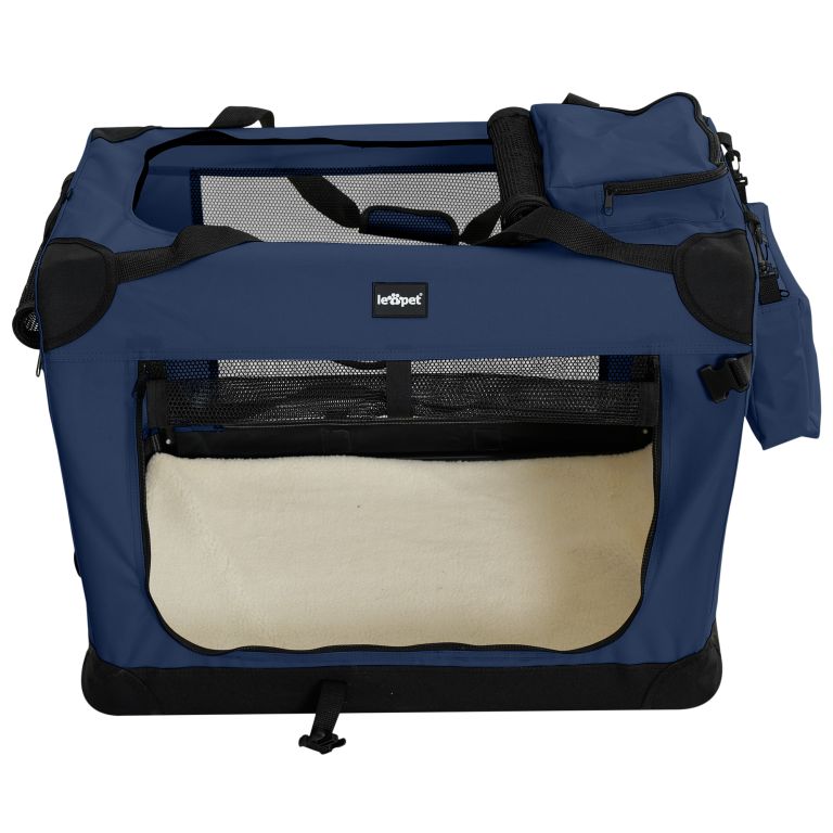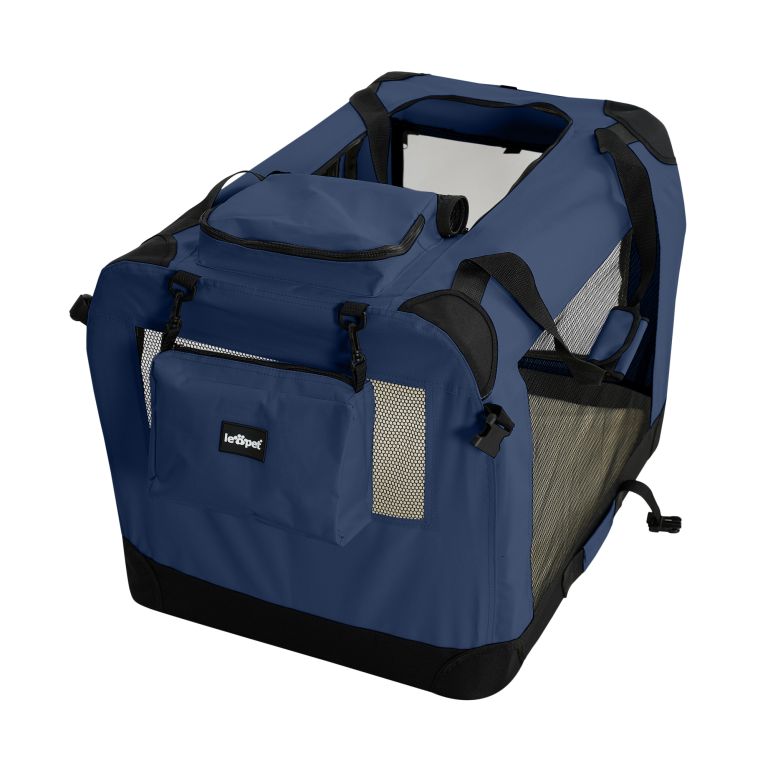 Cușcă pliabilă pentru câini cu mânere ergonomice, pernă și castron lavabile. Călătoriți fără stres și cu confort maxim.