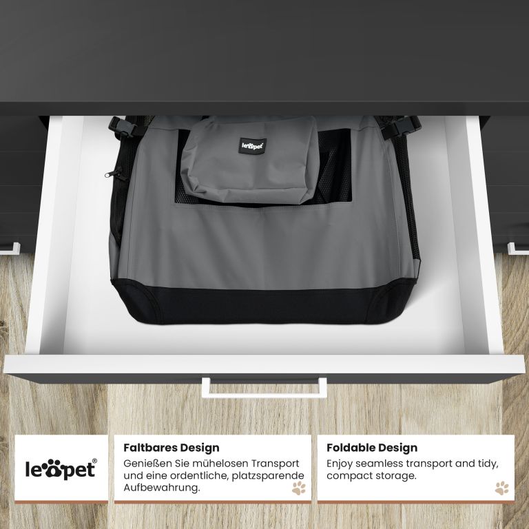 Cușcă pliabilă pentru câini cu mânere ergonomice, pernă și castron lavabile. Călătoriți fără stres și cu confort maxim.