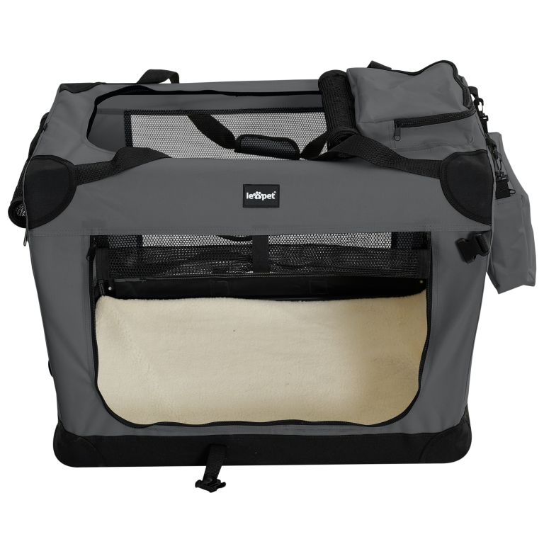 Cușcă pliabilă pentru câini cu mânere ergonomice, pernă și castron lavabile. Călătoriți fără stres și cu confort maxim.