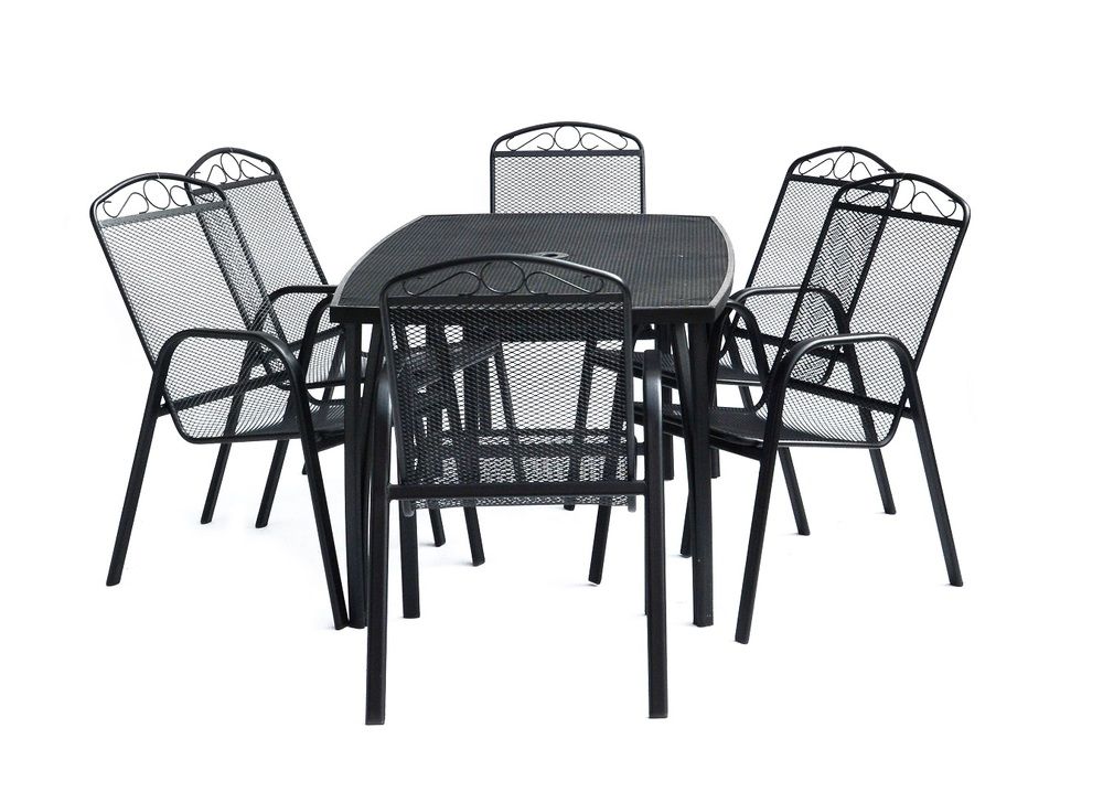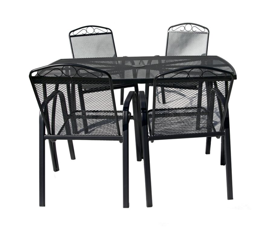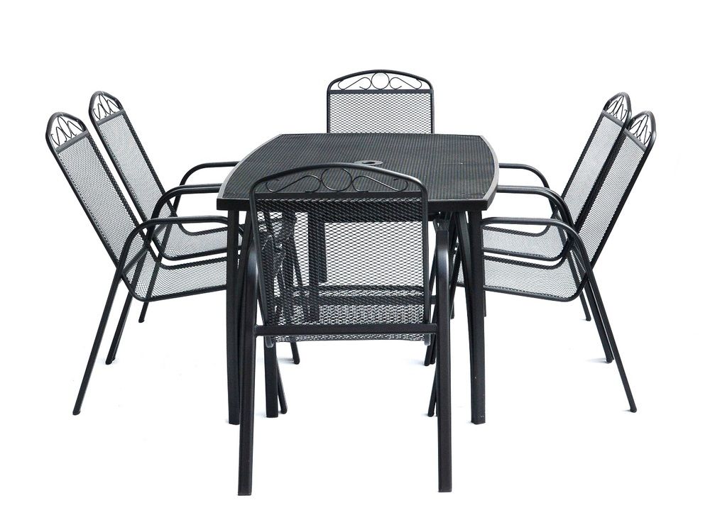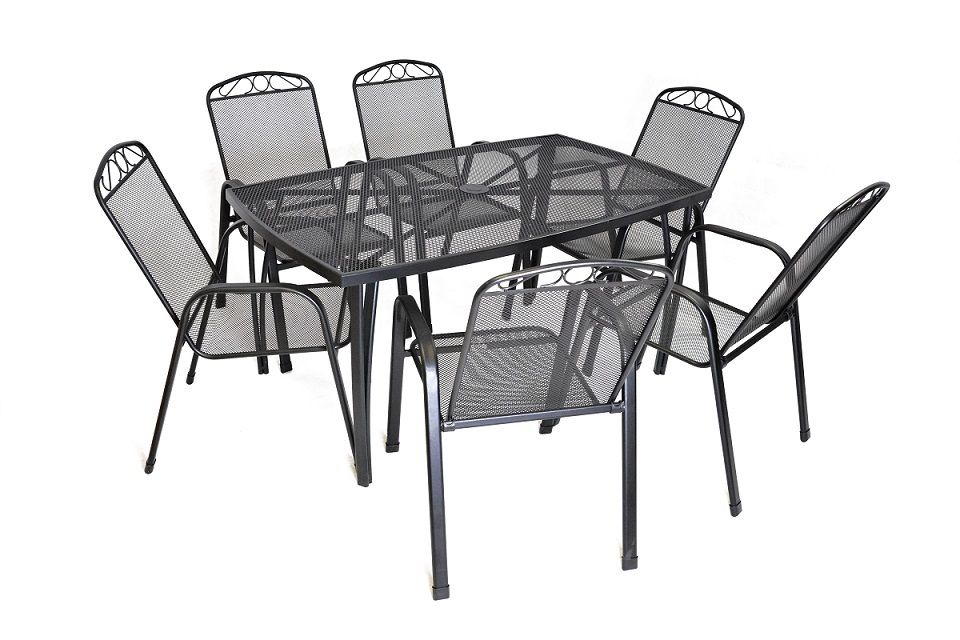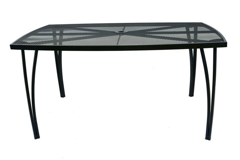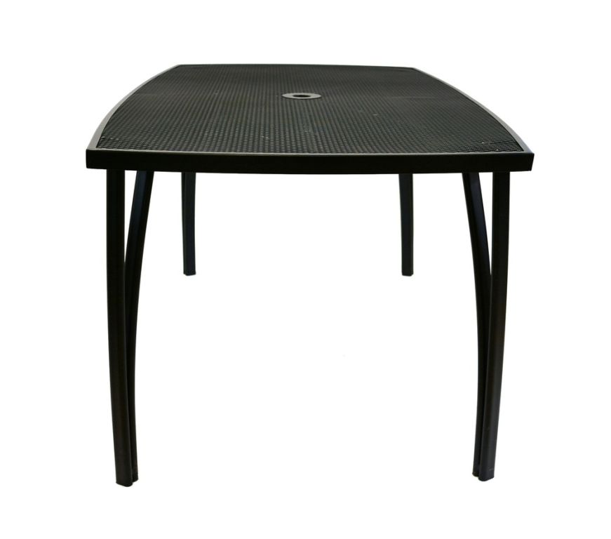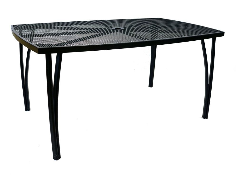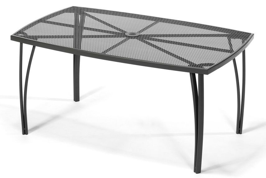 Masă de gradină din metal cu blat dreptunghiular din sarma. Se combină perfect cu toate tipurile de mobilier de grădină din metal. Este ușor de întreținut și de spălat. În mijlocul mesei este o deschidere pentru o umbrelă de soare.