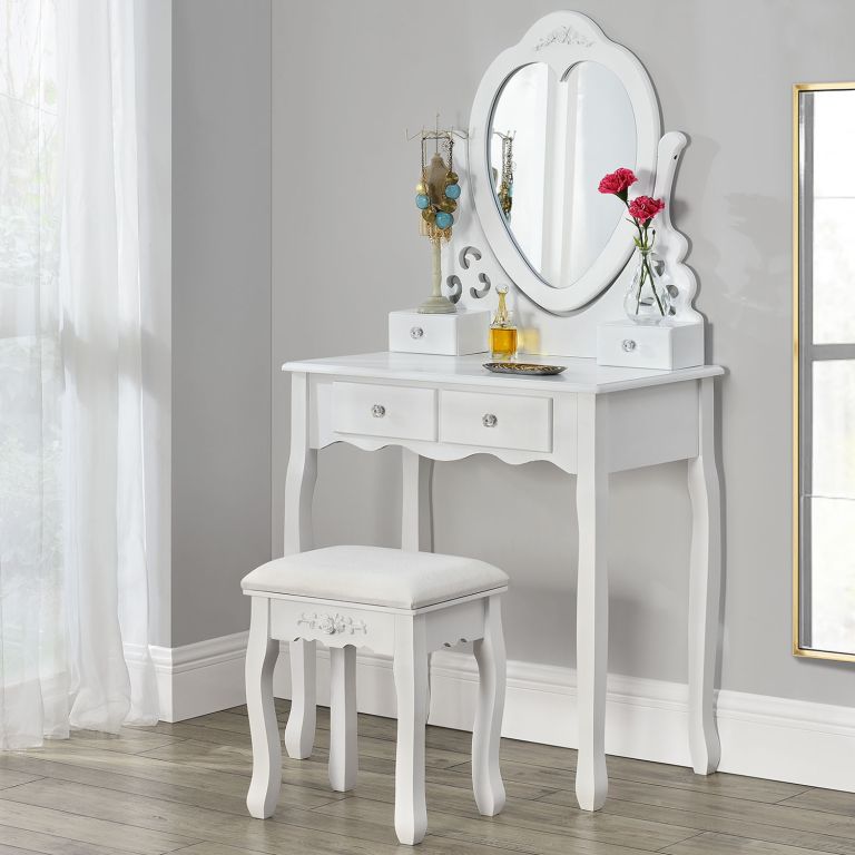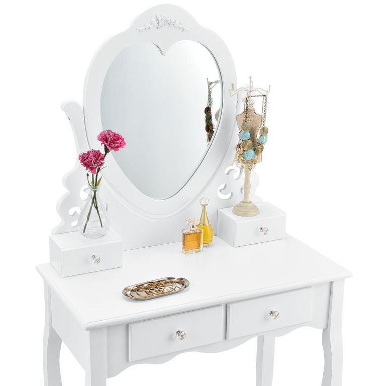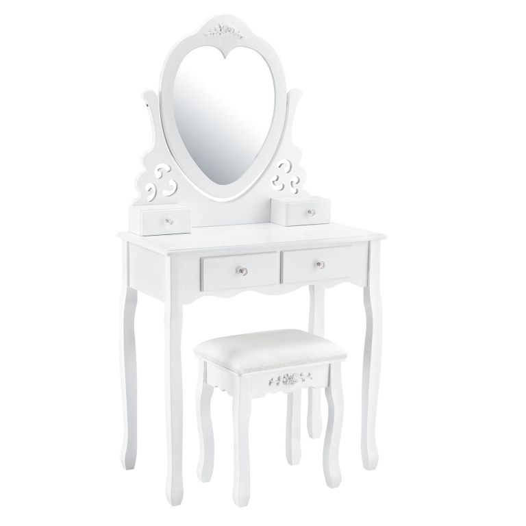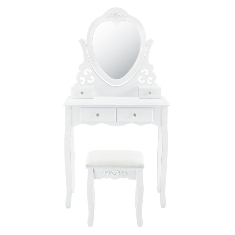 Masă de machiaj Julia cu oglindă inimă, patru sertare și taburet confortabil. Eleganță pentru dormitor.