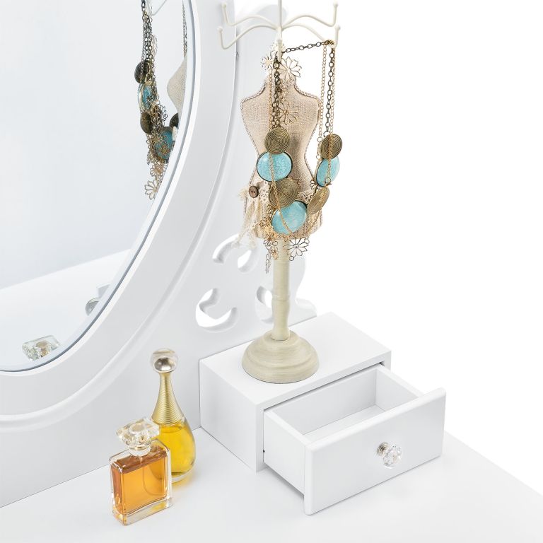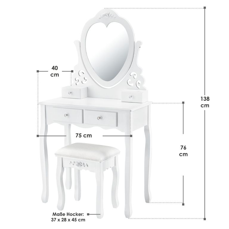 Transformați rutina de frumusețe într-o experiență specială cu masa de machiaj Julia. Designul delicat și oglinda în formă de inimă aduc o notă romantică, iar taburetul moale oferă confort la fiecare utilizare.