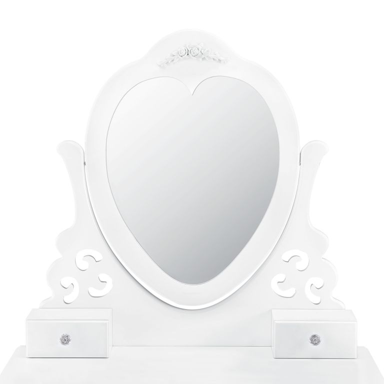 Vedeți descrierea mai detaliatăMasă de machiaj Julia cu oglindă inimă, patru sertare și taburet confortabil. Eleganță pentru dormitor.