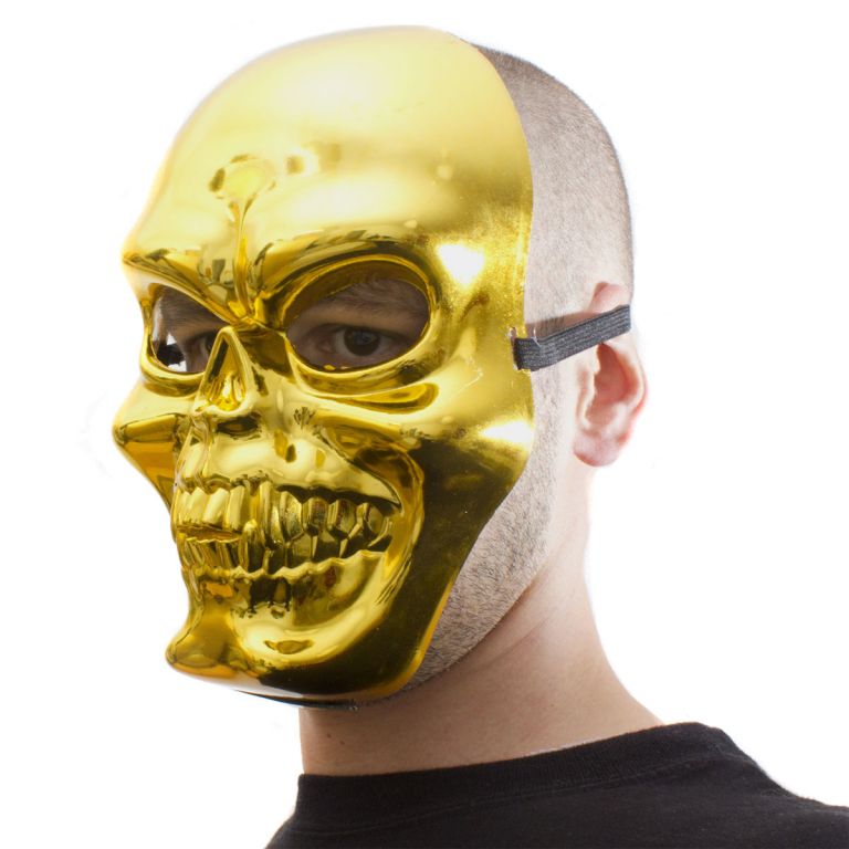 Masca craniu auriu este o versiune sublimă a lui Grim Reaper. Este mama tuturor măștilor înfricoșătoare: masca de schelet sau masca de craniu. Ne amintim de adversarul lui He-Man, Skeletor, răul personificat. În multe filme de groază, craniile care zac prin preajmă încep brusc să vorbească și prind viață - Moartea și toți răzbunătorii săi apar adesea sub forma unui craniu, craniul care râde fiind un simbol al răului triumfător. Masca de schelet argintie și aurie este o variantă nobilă a lui Grim Reaper. Fiind o semimască confortabilă, se poartă pe față cu o bandă elastică (fixată pe partea din spate a capului). Craniul nobil și strălucitor are găuri pentru ochi și nas și poate fi purtat confortabil pentru perioade lungi de timp, fie că este vorba de o petrecere, carnaval sau Halloween. Glamour șocant cu un factor de distracție ridicat!
