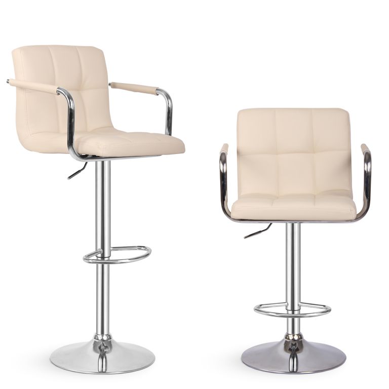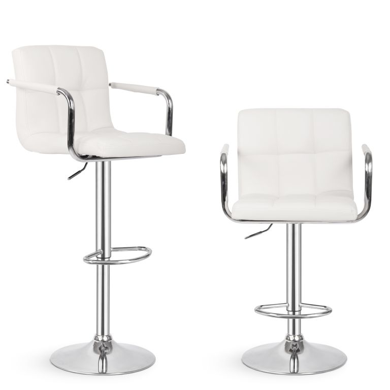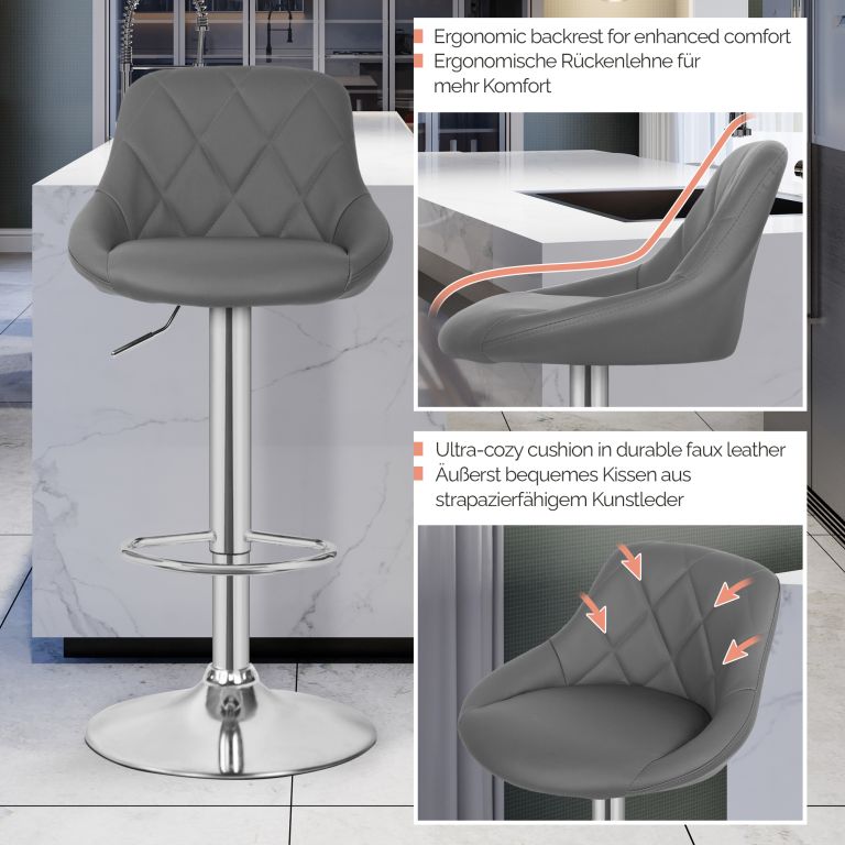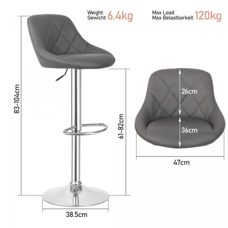 Transformați-vă spațiul cu aceste elegante scaune de bar, ideale pentru bucătărie, bar sau birou. Datorită mecanismului de reglare pe înălțime, acestea sunt adaptabile pentru diverse tipuri de blaturi, în timp ce cadrul din oțel cromat și baza rotunjită, cu diametrul de 38,5 cm, oferă stabilitate și durabilitate. Șezuturile sunt tapițate cu imitație de piele ușor de întreținut și asigură un confort maxim datorită umpluturii generoase din spumă cu grosimea de 5 cm. Cu o capacitate portantă de până la 120 kg, aceste scaune sunt potrivite pentru o varietate largă de utilizatori. Setul conține două scaune de bar echipate cu șezut rotativ la 360°, suport integrat pentru picioare, arc pneumatic ajustabil și o bază robustă pentru o susținere optimă.