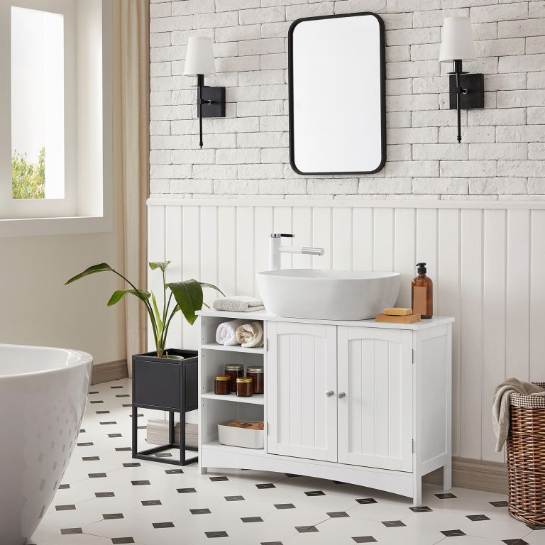 Transformați baia într-un spațiu ordonat și luminos cu acest mobilier elegant sub chiuvetă. Suprafața albă și detaliile cromate creează o atmosferă proaspătă, iar polițele deschise și închise vă oferă flexibilitate maximă.
