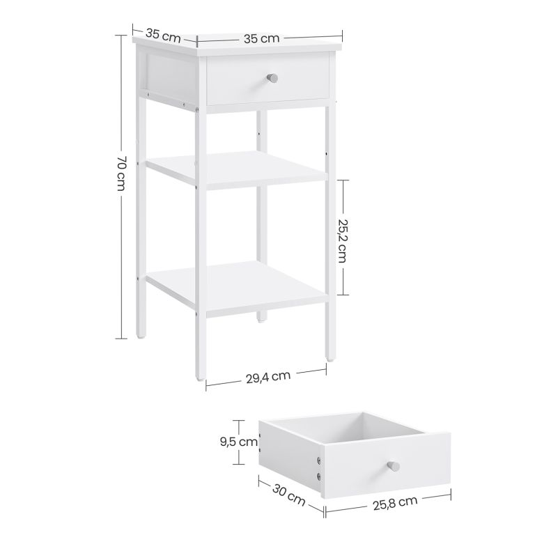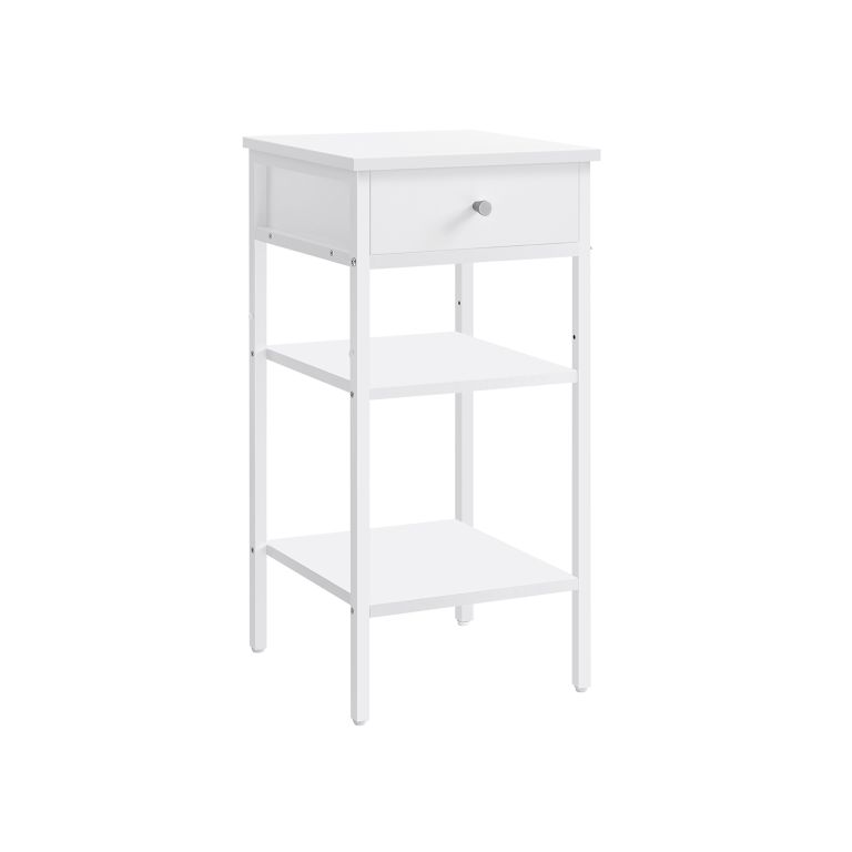 Noptieră modernă albă cu sertar și 2 polițe, 35x35x70 cm