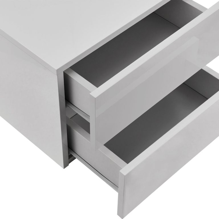 Noptieră modernă suspendată cu două sertare, de culoare albă, ideală pentru economisirea spațiului.