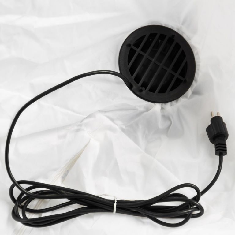 Omul de zăpadă se umple rapid și își recapătă forma datorită unui mic ventilator care, la fel ca iluminatul, este alimentat de un adaptor de curent alternativ. Ochelele sunt atașate de ambele părți ale omului de zăpadă, cu ajutorul cărora puteți fileta cabluri pentru a vă asigura că acesta va sta întotdeauna drept.