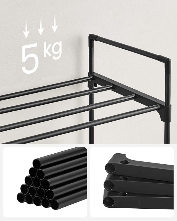 Fabricat din oțel durabil și plastic, pantofarul asigură stabilitate și rezistență. Montajul este intuitiv, fără scule, iar întreținerea este minimă. Fiecare raft suportă până la 5 kg.