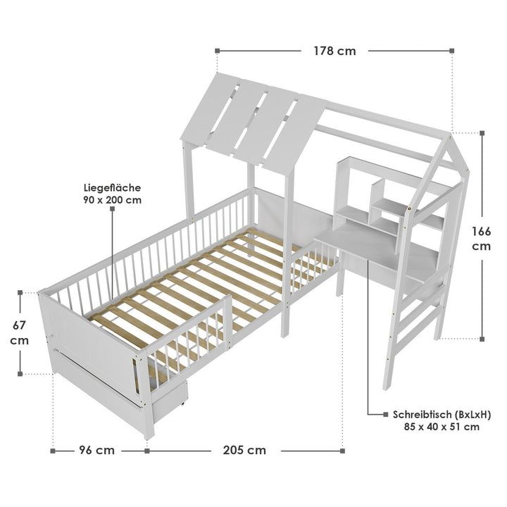 Pat pentru copii tip căsuță Yari cu sertare și birou, alb