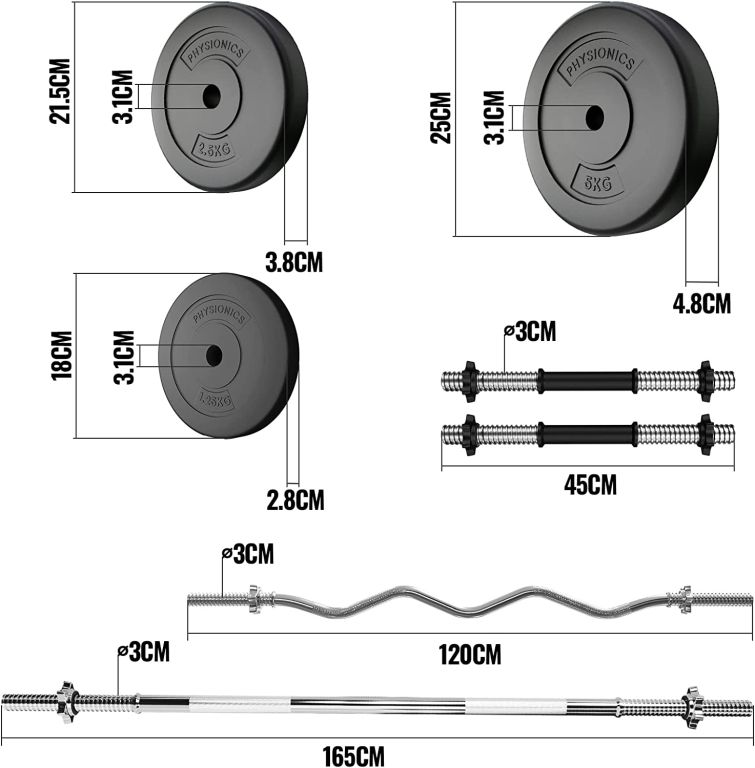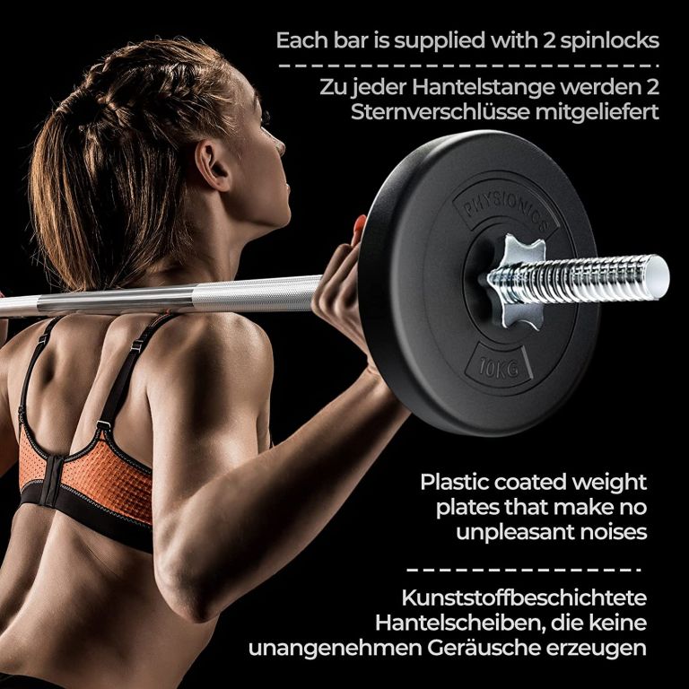 Ganterele scurte au o suprafață antiderapantă pentru a vă asigura că mâinile nu alunecă de pe bară. Luați în considerare obiectivele și abilitățile personale și ajustați acest set de gantere pentru a se potrivi planului dvs. de antrenament. Discurile de haltere au un strat de plastic durabil, prietenos cu podeaua, care reduce plierea și lovirea metalului.