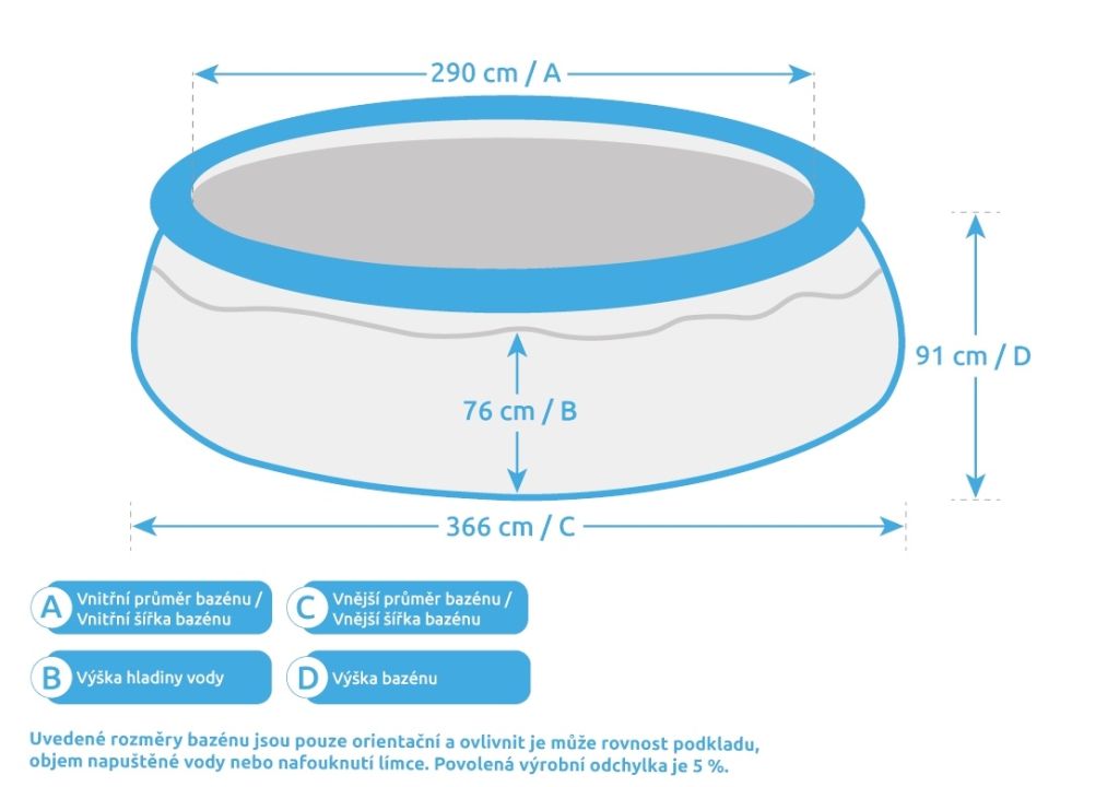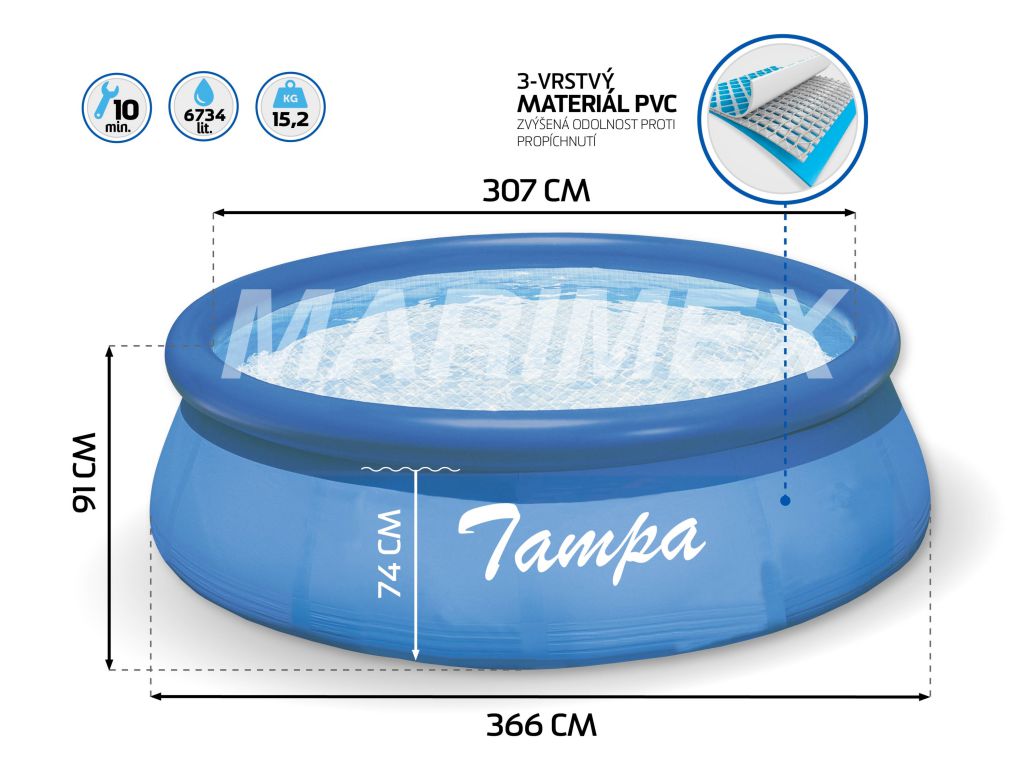 Piscina este una dintre cele mai bine vândute și cele mai populare piscine din Republica Cehă. Oricine se poate bucura cu adevărat de o baie în propria piscină. Avantajele piscinei Tampa sunt prețul redus, întreținerea ușoară și punerea în funcțiune rapidă. Tot ce trebuie să faceți este să pregătiți locul pentru piscină, să derulați covorașul pentru piscină, să despachetați piscina, să umflați gulerul superior și să începeți să umpleți cu apă. Apa în creștere va construi piscina în sine. Vă puteți umple cu apă în decurs de 10 minute de la despachetarea piscinei. După sfârșitul sezonului de piscină, piscina trebuie curățată, drenată și curățată într-un loc uscat, fără îngheț. O întreținere adecvată va prelungi durata de viață a piscinei. Vă recomandăm să acoperiți piscina cu o prelată după înot. Pentru umflarea ușoară, vă recomandăm să achiziționați o pompă manuală sau electrică.