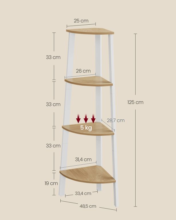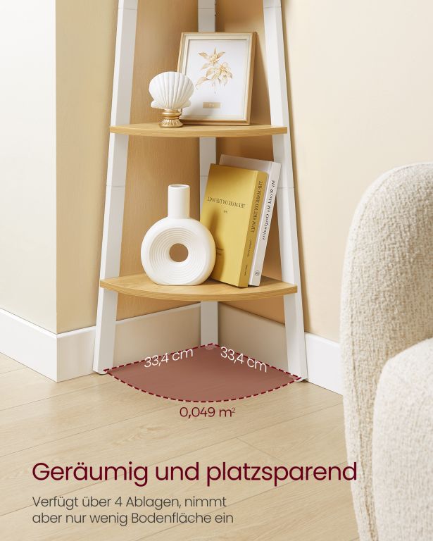 Vedeți descrierea mai detaliatăPoliță de coltcu 4 etaje, design stejar și alb, stabilă, cu sistem anti-răsturnare.