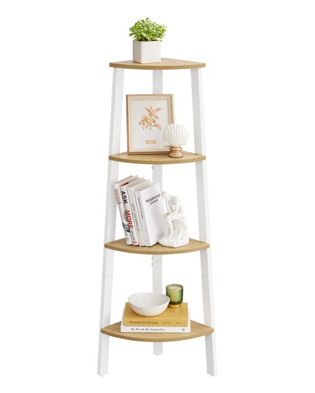 Poliță de coltcu 4 etaje, design stejar și alb, stabilă, cu sistem anti-răsturnare.
