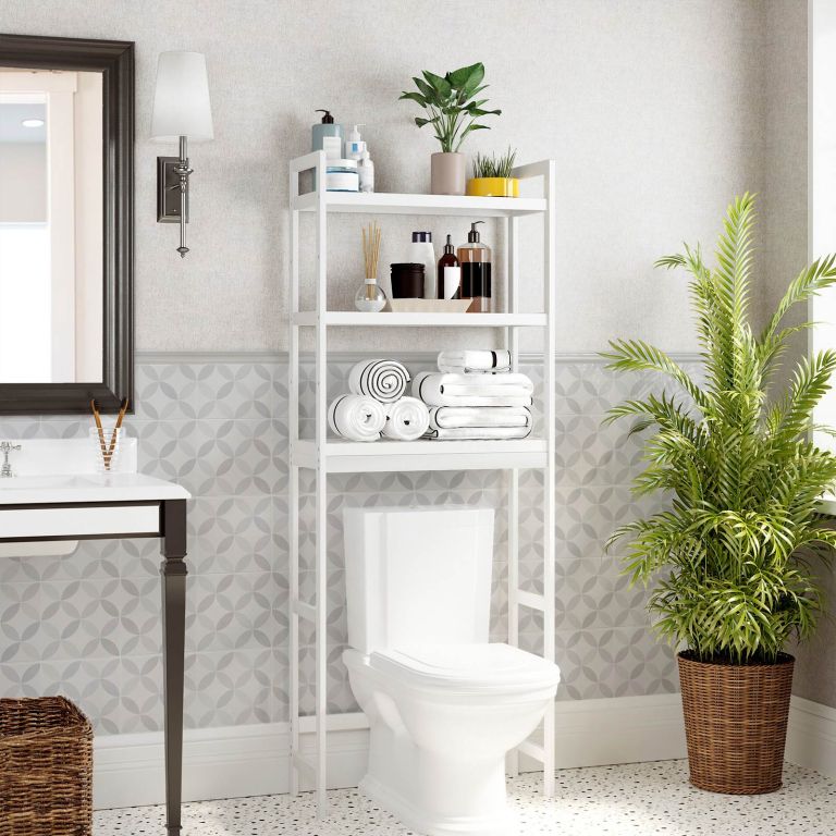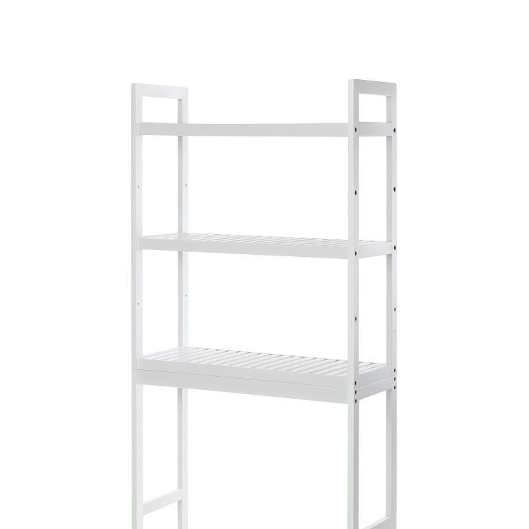 Adăugați prospețime și ordine băii dumneavoastră. Acest raft cu trei niveluri din bambus, în nuanță elegantă de alb, oferă spațiu generos pentru toate produsele de igienă, fără a ocupa mult loc. Polițele reglabile se adaptează nevoilor, fie că depozitați cosmetice mici sau sticle înalte de șampon.