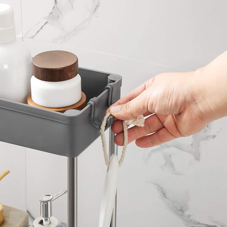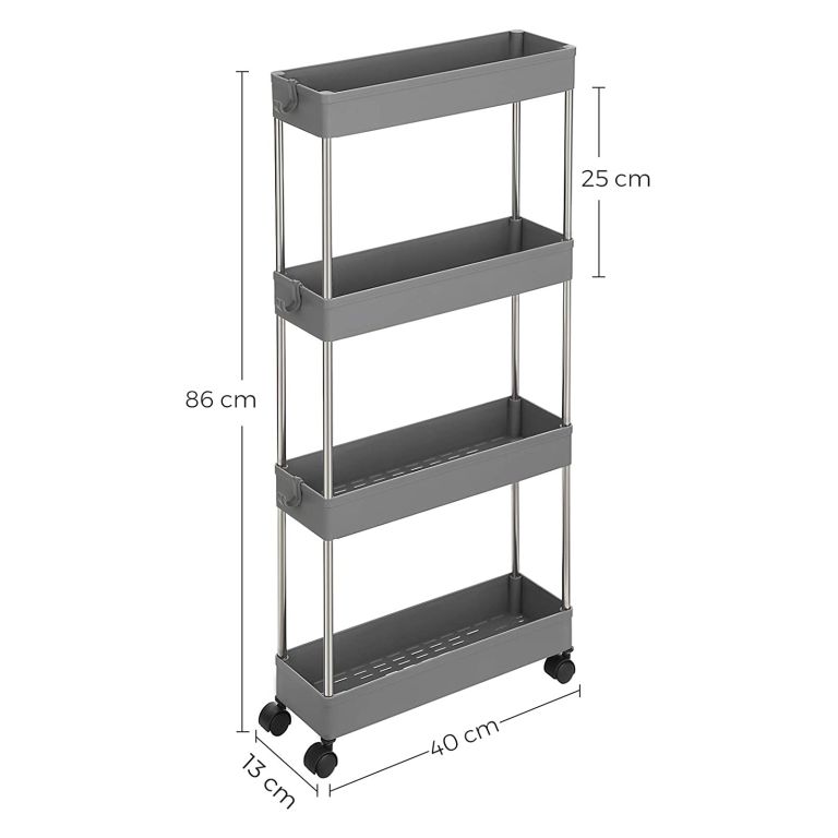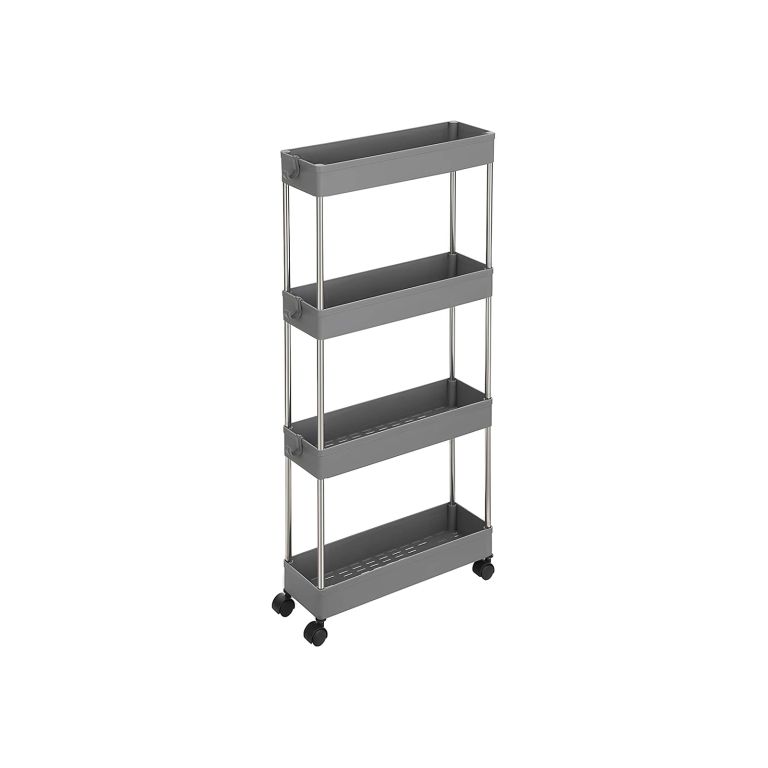 Găsiți loc pentru fiecare lucru cu acest raft îngust pe roți, perfect pentru spații mici. Aspectul gri elegant completează orice decor modern.