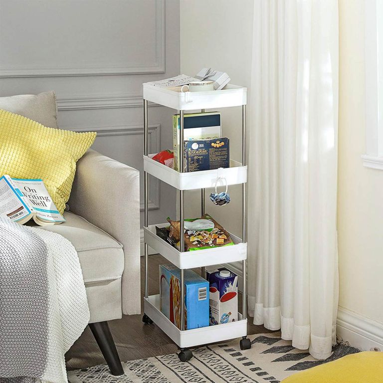 Raft îngust pe roți cu 4 polițe și 6 cârlige, alb, 40x22x86