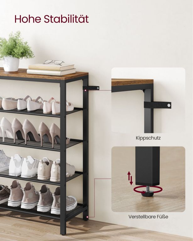 Vedeți descrierea mai detaliatăRaft pentru pantofi cu 4 polițe, design industrial, lemn rustic și oțel, stabil și spațios.