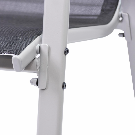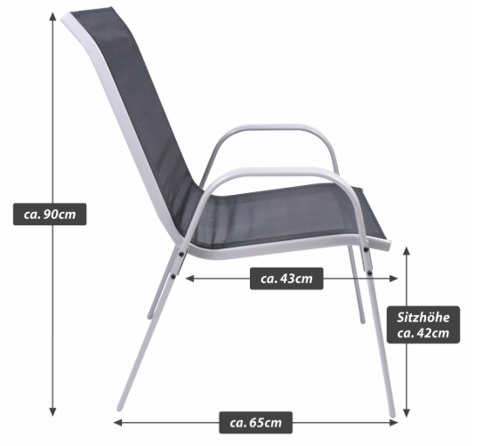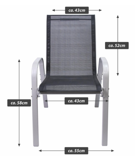 Scaunul BARI îmbină un cadru solid din oțel cu țesătură elastică textilen – materiale rezistente la intemperii și ușor de întreținut. Dimensiunile de 90 × 55 × 65 cm și construcția stivuibilă permit depozitarea practică și folosirea eficientă chiar și pe spații mai mici.