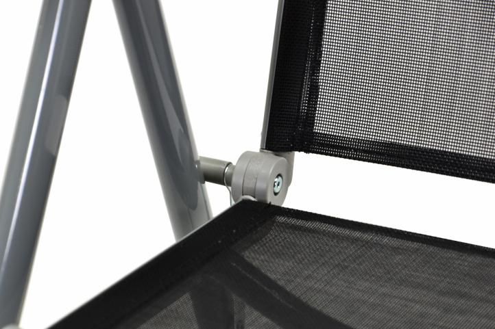 Scaunul de calitate, ușor și compact este fabricat din aluminiu și are husă respirabilă. Șapte trepte reglabile ale spătarului asigură un confort maxim Scaunul este rezistent la condiții meteorologice și este potrivit pentru terasă, grădină, balcon, piscină sau camping.