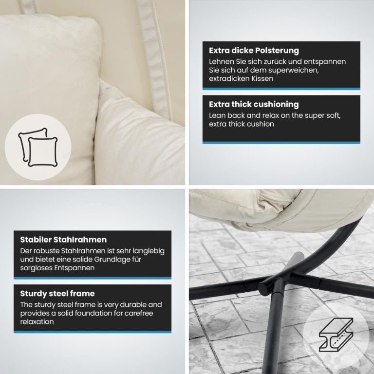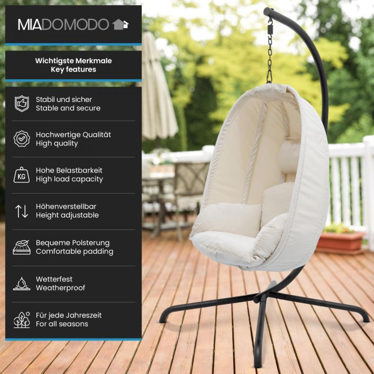 Scaunul nostru suspendat premium este mai mult decât un loc de șezut, este combinația perfectă de confort și stil pentru orice spațiu exterior. Scaunul, susținut de un cadru robust din fier cu o capacitate impresionantă de 160 kg, promite nu doar durabilitate, ci și stabilitate fiabilă. Înălțimea reglabilă a leagănului nostru suspendat adaugă versatilitate pentru relaxarea dumneavoastră. Acum puteți ajusta poziția de șezut conform preferințelor dumneavoastră. Coșul de șezut din fier este completat de perne din poliester moale, care oferă nu doar suport, ci și confort suplimentar. Oferiți un aer sofisticat vieții dumneavoastră exterioare cu acest scaun suspendat elegant și funcțional.