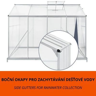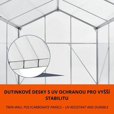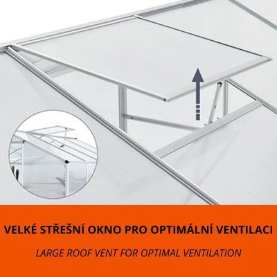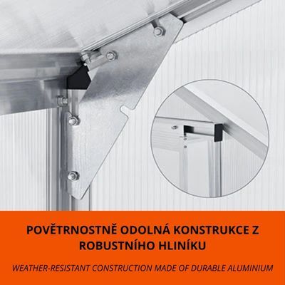 Construcția din aluminiu este durabilă și ușor de întreținut. Panourile din policarbonat de 4 mm protejează plantele de radiațiile UV și intemperii. Baza solidă din oțel galvanizat asigură o fixare sigură. Montajul este rapid, iar întreținerea minimă.